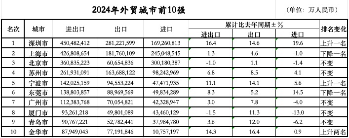 第一财经梳理海关总署的数据,2024年全国外贸前10强城市别离为:深圳、上海、姑苏、宁波、东莞、金华、广州、、杭州和青岛。比宁波更猛的是正在2023年排名第二的深圳,凭仗16。4%的增速跃升至2024年的全国外贸“冠军”。除了时隔9年后沉返内地外贸城市首位,深圳本身也实现了更多冲破2024年4。5万亿元的进出口规模为初次冲破4万亿,16。4%的同比增速别离较全国、广东省快11。4个、6。6个百分点。进口、出口也均为汗青新高,此中,出口2。81万亿元,增加14。6%,实现32连冠;进口1。69万亿元,增加19。6%。2024年全年8838万份报关单中的最初一张,记实的恰是深圳一家平易近营企业的出口消息。这张报关单为2024年中国外贸进出口画上了一个句号。也恰是正在这一年,深圳平易近营企业的外贸规模占比初次冲破7成。2024年,深圳平易近营企业有进出话柄绩企业数量近4。7万家,企业数量占比近9成,合计进出口3。16万亿元,增加24。2%,占同期总值的70。1%,比沉较2023年提拔4。4个百分点,成为拉动深圳外贸增加的次要动力。宁波的平易近营企业数量占比更是跨越了9成,外贸规模则接近8成。数据显示,2024年,宁波的平易近营企业数量已添加至近2。7万家,占同期宁波市外贸企业总数的90。9%,此中,外贸规模超亿元平易近营企业数量添加至1690家。同期,宁波平易近营企业进出口1。09万亿元,增加13%,占全市进出口总值的76。6%。进出口总值从第六名升至第五名之外,宁波的出口规模正在全国城市中排名第四,仅次于深圳、上海和姑苏。另一座正在2024年较着上升的城市是坐拥“世界小商品之都”义乌的金华。从2023年的第12位跻身全国前10强的跃升,也让金华初次超越杭州,位居浙江省第二。浙江金华海关的动静称,2024年金华外贸规模再立异高,共实现外贸进出口总值8794。9亿元,同比增加14。3%,增速居浙江省首位。出口做为其强项,客岁金华出口达7719。2亿元,同比增加16。4%,占浙江省的份额为19。8%,创下汗青新高。金华的进出口近8成由义乌贡献,而义乌的平易近营经济占领了90%以上的市场从体、实现了90%以上的P。2024年前11个月,浙江省义乌市进出口总值就冲破了6000亿元,同比增加17。6%。此中出口5420。6亿元,同比增加17。4%;进口719。3亿元,同比增加19。0%,进出口、出口和进口值占全省份额别离为12。8%、15。2%和5。8%,占比别离提拔1。2、1。1和0。9个百分点。面临全球订单的碎片化趋向,市场采购模式对本地甚至周边的出口具有较着的拉动感化。2024年前11个月,义乌市通过市场采购商业体例出口4350。2亿元,同比增加21。7%,占义乌市出口总值的80。3%,拉动义乌市出口增加16。8个百分点。另据浙江中国小商品城集团股份无限公司数据,2024年,义乌中国小商品市场日均人流22。43万人次,此中日均外商超3900人,创10年新高。除了正在外贸前10强中实现了跃升的城市案例,平易近营企业的贡献也正在持续提高。2024年,我国平易近营企业进出口24。33万亿元,增加8。8%,占全国外贸总值的比沉提拔至55。5%,继续成为外贸第一大运营从体。的数据还显示,2024年的平易近企进出话柄现了三个“初次”,别离是有进出话柄绩的平易近营企业数量初次跨越60万家,达到60。9万家;平易近营企业初次成为我国高手艺产物的最猛进出口从体;平易近营企业占我国消费品进口比沉初次跨越50%,同比提拔2。8个百分点至51。3%,此中正在日化用品、生果等产物中比沉跨越六成。