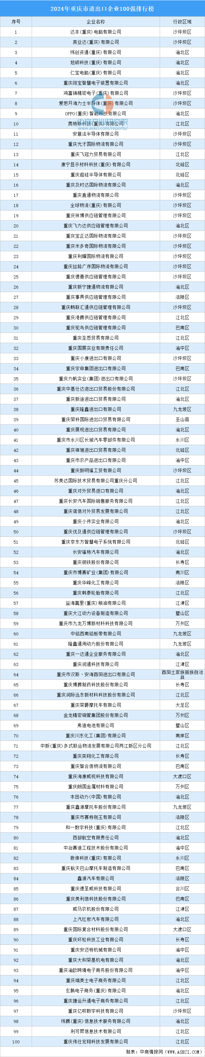 中商谍报网讯:3月13日,进出口商会2024年度会员大会暨“稳增量、提质量”外贸从题勾当举行,进出口企业100强榜单揭晓,达丰电脑无限公司等100家企业上榜。进出口企业100强企业中,渝北区、江北区16家企业上榜,巴南区各5家企业上榜。