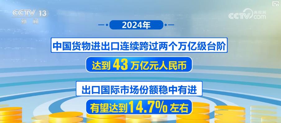 2024年,中国货色进出口持续跨过两个万亿级台阶,达到43万亿元人平易近币。出口国际市场份额稳中有进,无望达到14。7%摆布。有进出话柄绩的企业近70万家,此中平易近营企业占比跨越八成。同时,“立异”成为中国外贸的明显底色,通过智能化、数字化、绿色化的持续转型升级,中国产物的立异力获得了全球消费者的青睐。中国新业态的潜力仍正在持续,“鼠标一点,买卖全球”,也支持其持续数年实现两位数增加。