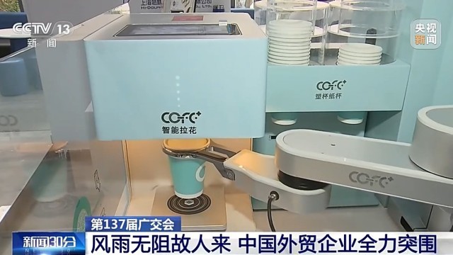 正在广交会现场,“50秒一杯”的机械人咖啡亭成为“爆品”,不少外国客商甘愿列队2小时,也要喝上一杯机械人“手冲”咖啡。